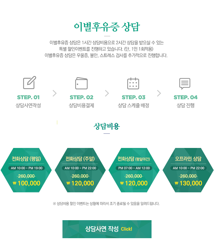 이별후유증 상담은 1시간 상담비용으로 2시간 상담을 받으실 수 있는 특별 할인이벤트를 진행하고 있습니다.