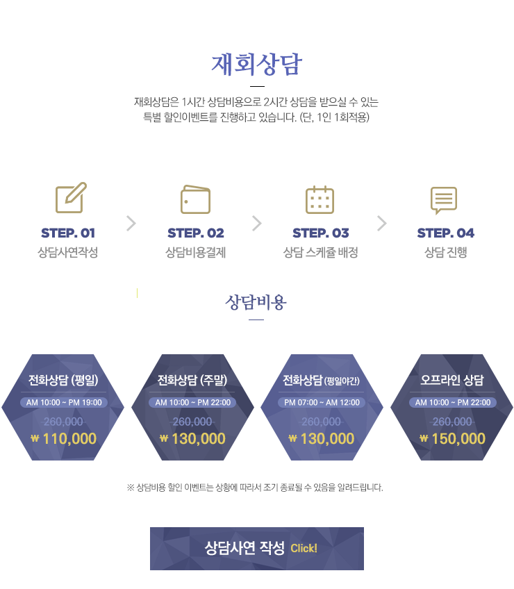 재회상담은 1시간 상담비용으로 2시간 상담을 받으실 수 있는 특별 할인이벤트를 진행하고 있습니다. (단, 1인 1회적용)